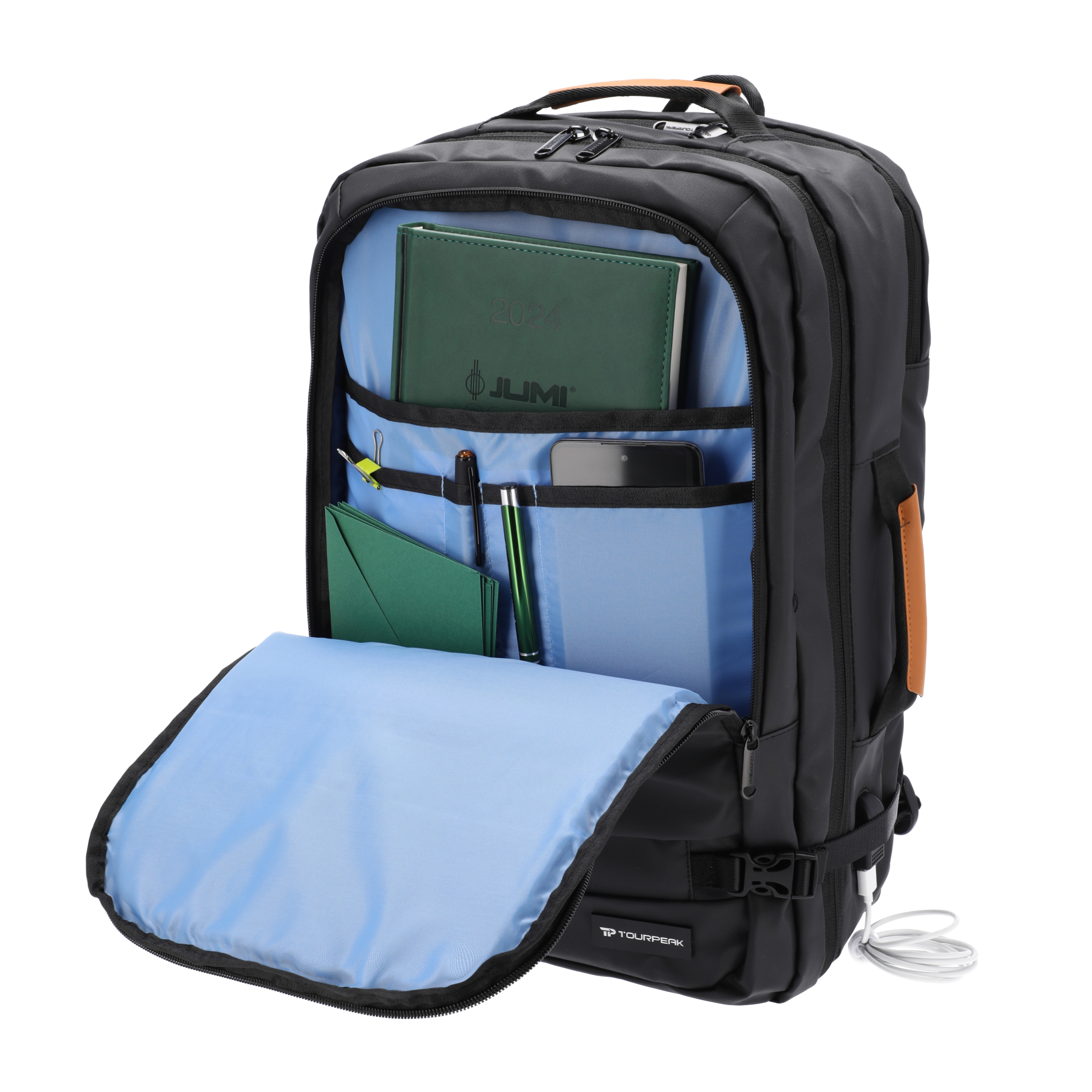 Wbudowany kabel z wyjściem zewnętrznym. Zestaw pozwala na podłączenie powerbanka wewnątrz plecaka i podłączenie telefonu kablem od ładowarki poprzez wejście USB